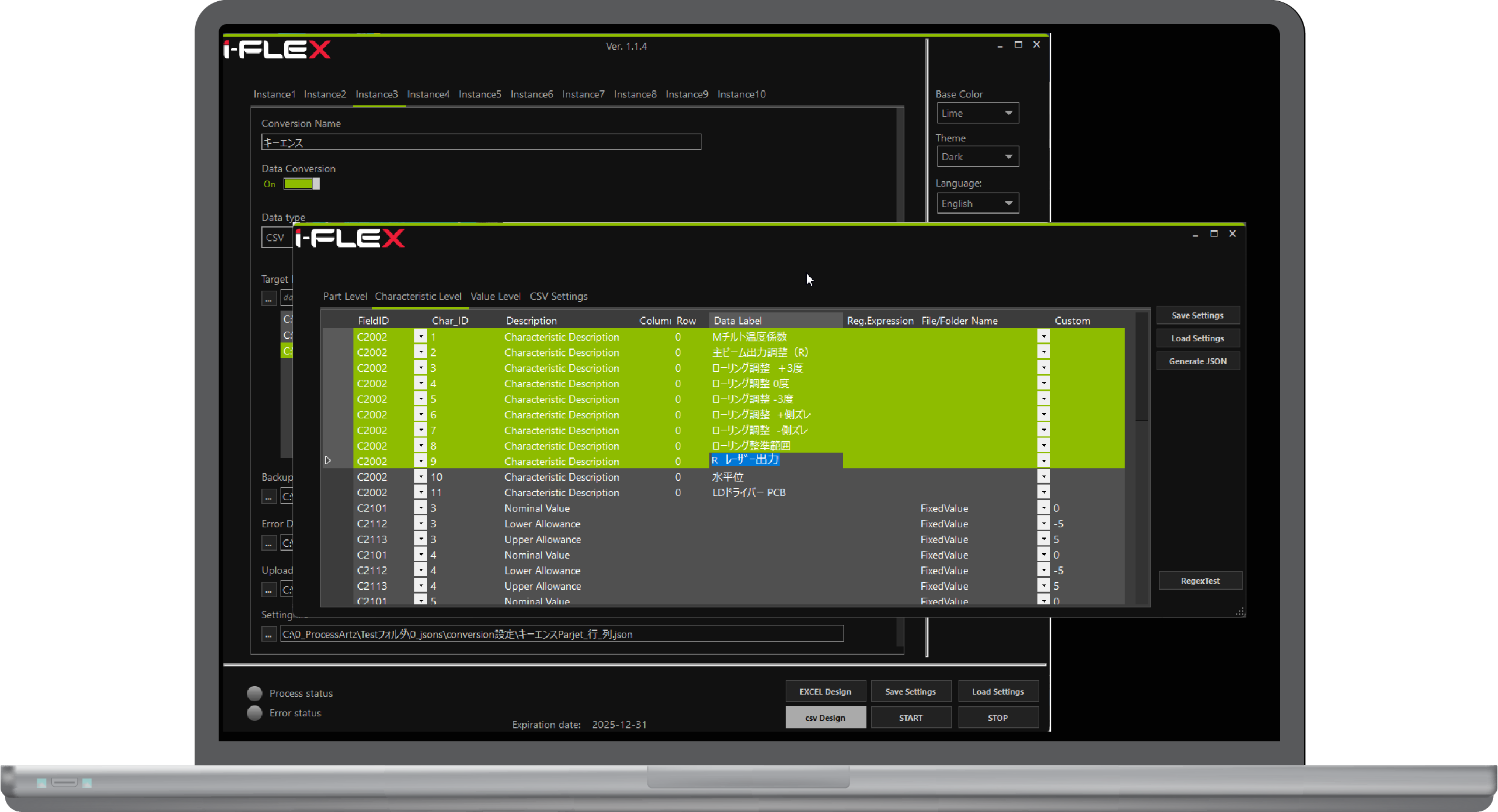 i-FLEXは主に測定機器から出力されるテキストファイル(csv, txt等)のデータや、手入力集計に使用されるEXCELを統一形式(JSON)へ自動変換するアプリケーションです。INDEQSシリーズはJSONを標準形式として採用しています。