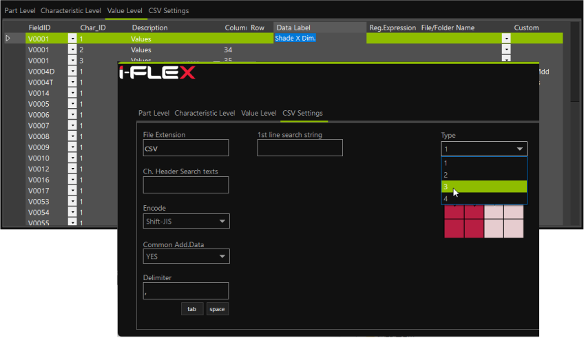 i-FLEX classifies data structures into four types and processes them accordingly. Users can configure file parameters such as encoding and delimiter, and specify how each INDEQS data field should be mapped—by column, row, or data label (header).