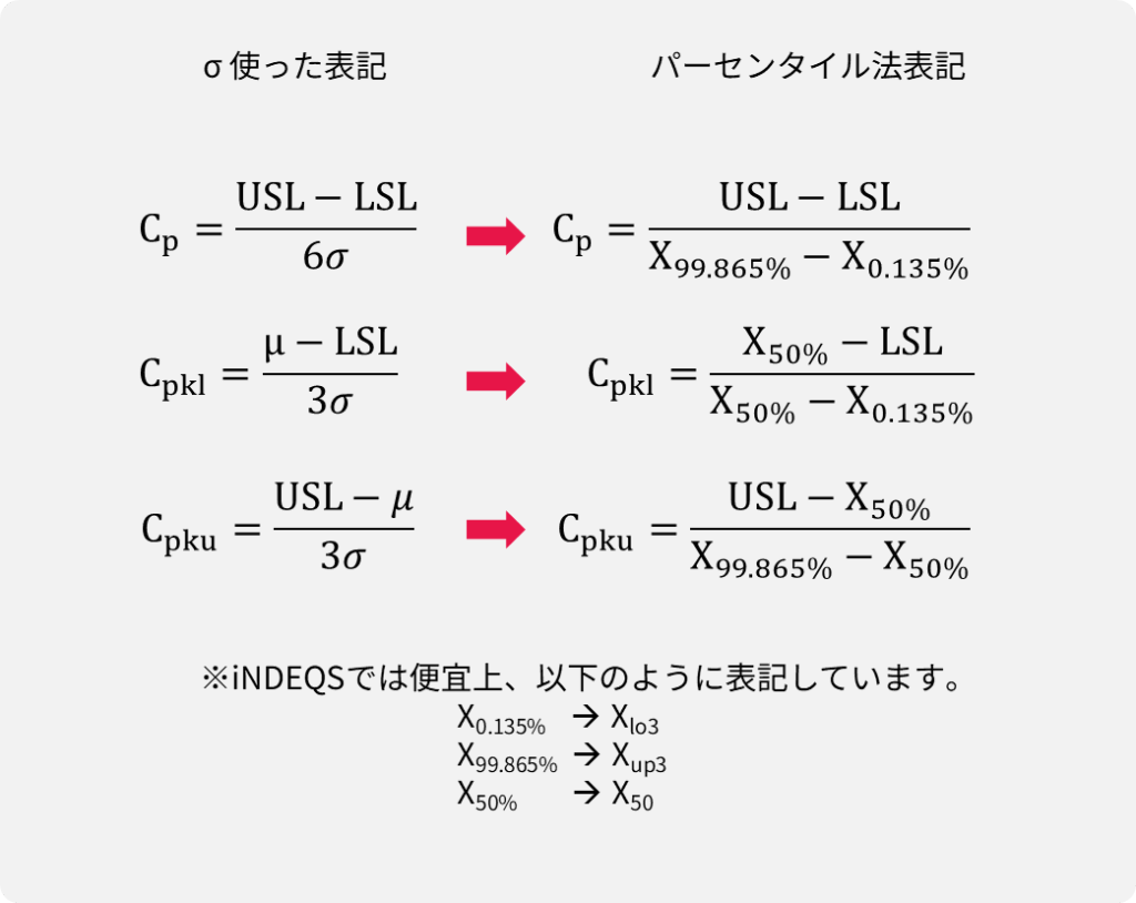 非正規分布の場合、平均(μ)より外れ値に強い中央値を使うので、平均(σ)から中央値(パーセンタイル表記=X50%)に変更し、分布範囲(分母)の99.73%の部分をパーセンタイル法表記に変えるだけです。数字を入れ替えれるだけでCp/Cpkの基本的な数式が成り立ちます。