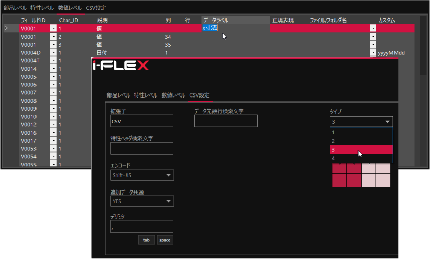 測定機器や生産設備から出力されるテキストファイルフォーマットは多岐にわたり、柔軟なマッピング機能が必要です。i-FLEXはデータの並びを4タイプに分類して処理します。データエンコードやデリミタなどのファイル情報を設定し、それぞれのINDEQSデータフィールドに対応するテキストデータの位置を列、行、データのラベル(ヘッダ)などから検索できるよう設定します。