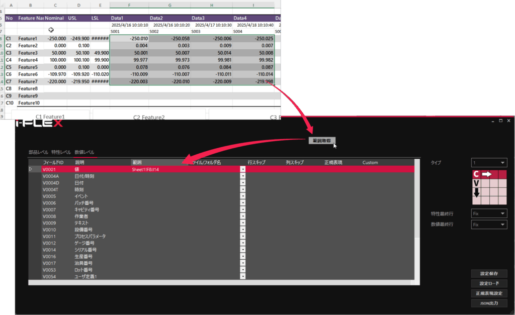 データ取り込み範囲をEXCEL上で範囲指定し、範囲取得ボタンで各項目のデータ収集範囲を直観的に指定する事が可能です。