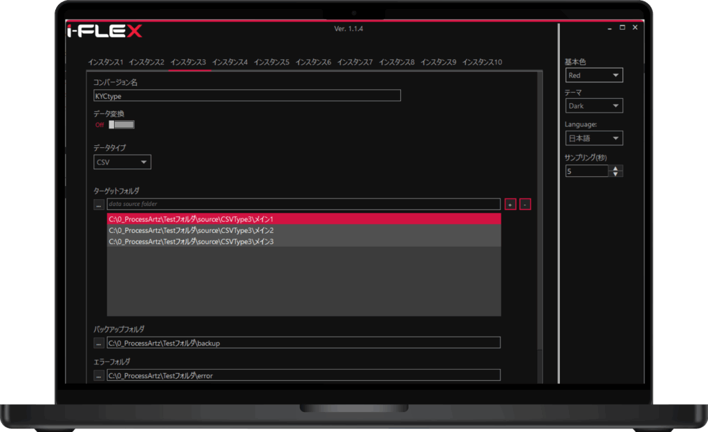 フォーマットごとにINDEQSデータフィールドへのマッピングルールをアプリ上で設定できます。一度設定したマッピングルールはマッピング設定ファイルとして保存され、以降同じフォーマットのファイルは自動変換処理を行う事が可能です。i-FLEXは複数のデータフォルダ、異なる形式のデータを同時に扱う事が出来ます。マルチスレッド処理によりEXCELファイルもテキストファイルも同時並行で処理し、大量のデータファイルも素早く変換します。